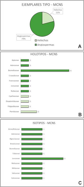 Figure 1. Type specimens housed in the MCNS Herbarium. A. Percentage of ferns (light green) and angiosperms (dark green). B. Families represented by holotypes and number of species per family. C. Families represented by isotypes and number of species per family.