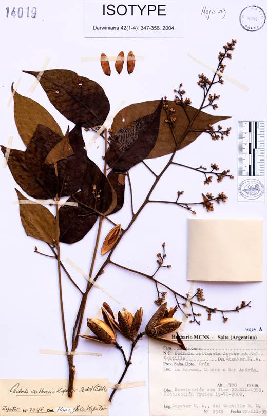 Ref.: Zapater, M. A., del Castillo, E. M., & Pennington, T. D. (2004). El género Cedrela (Meliaceae) en la Argentina. Darwiniana, nueva serie 42(1-4), 347-356. https://doi. org/10.14522/darwiniana.2014.421-4.199